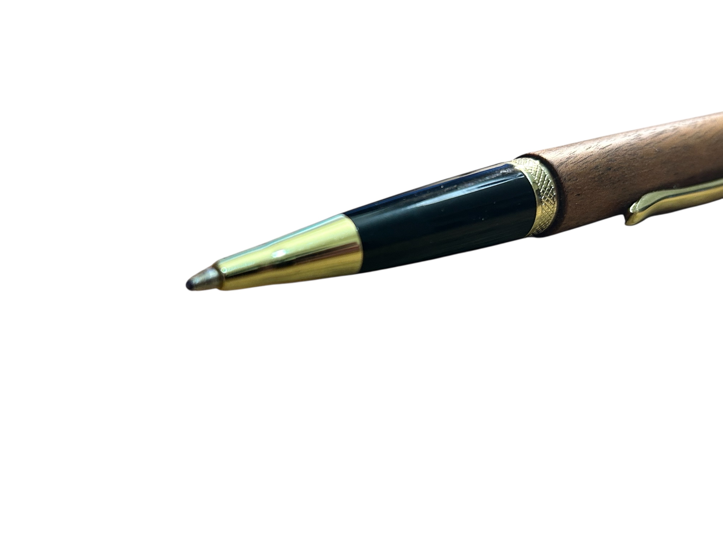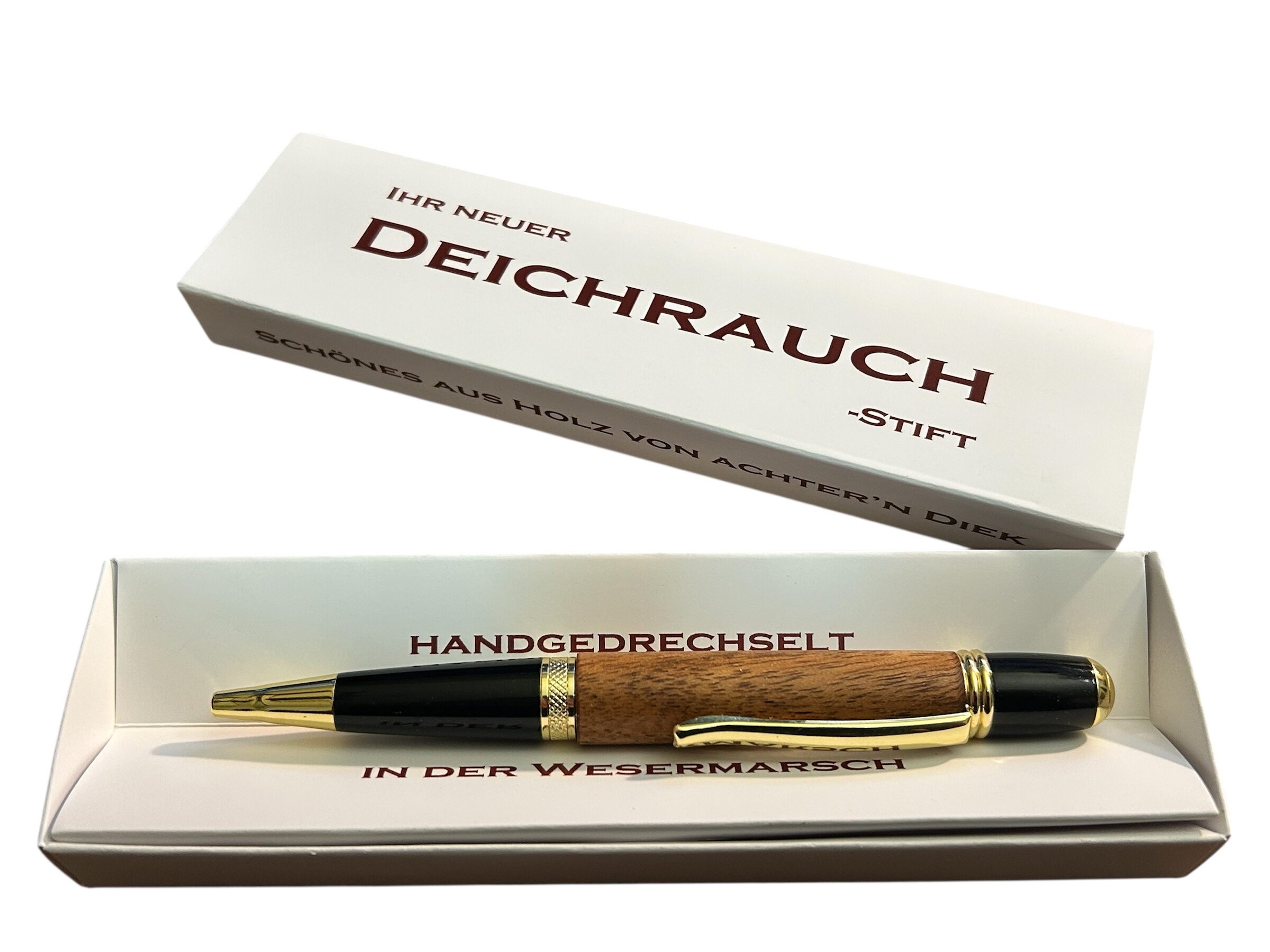Handgedrechselter Dreh-Kugelschreiber mit goldfarbenen Metallteilen.