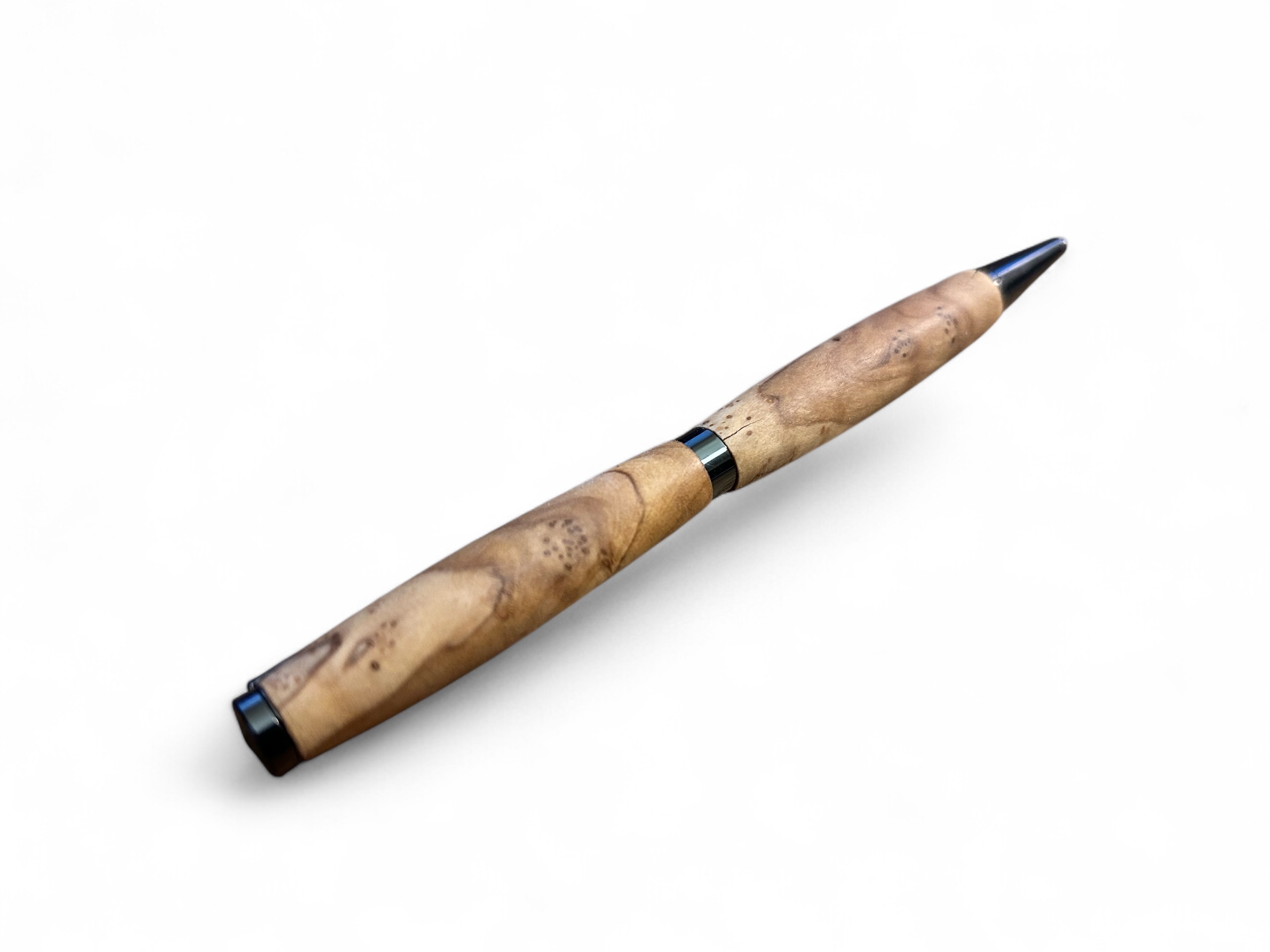 Handgedrechselter Dreh-Kugelschreiber mit matt-schwarzen Metallteilen.