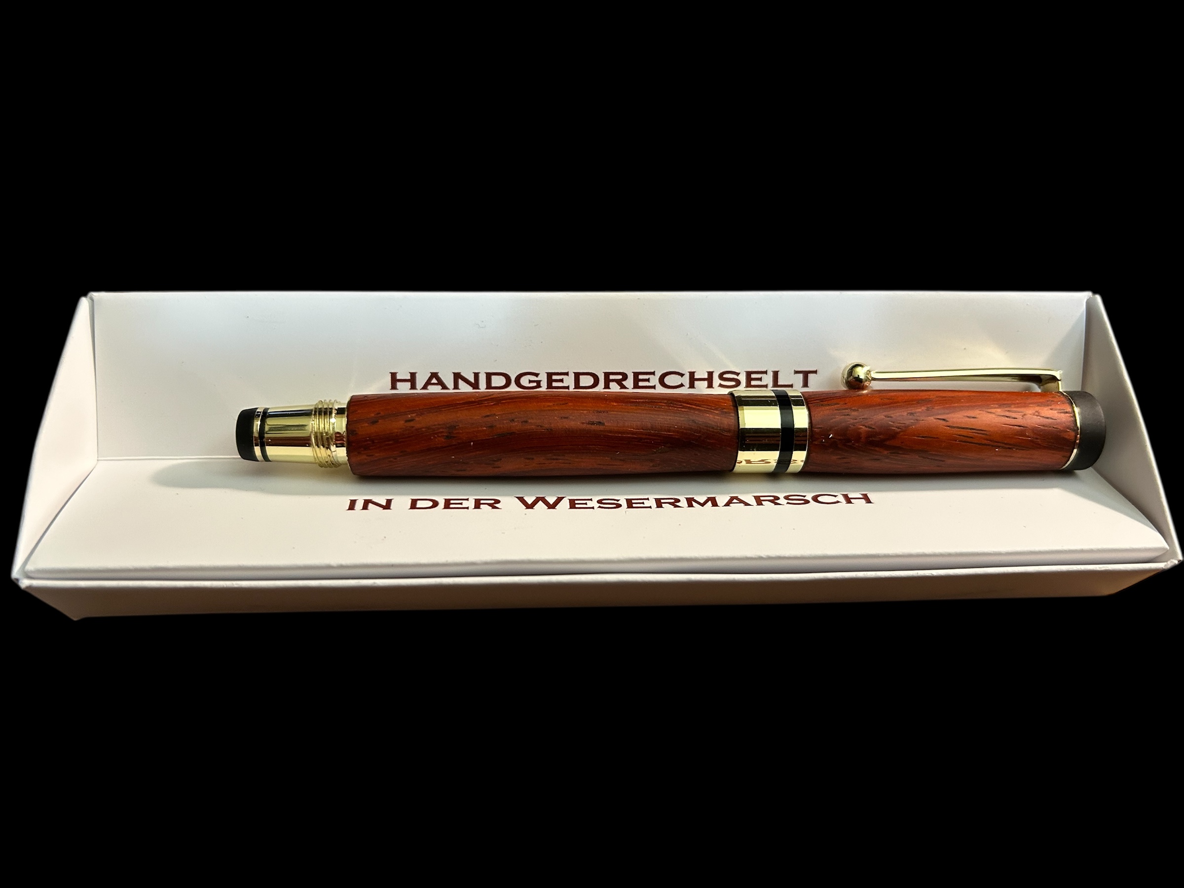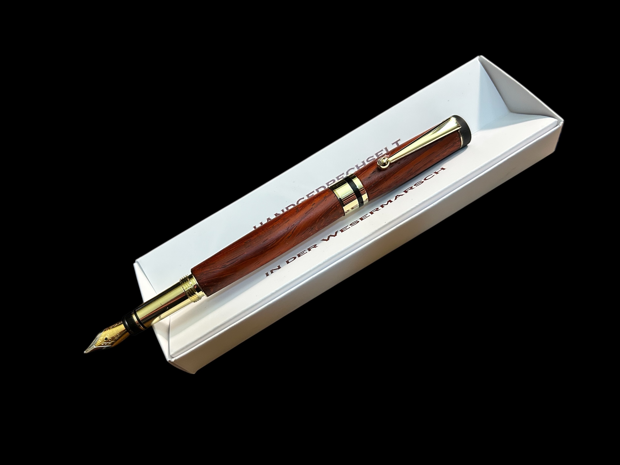 Handgedrechselter Füllfederhalter aus Padouk mit goldfarbenen Metallteilen.