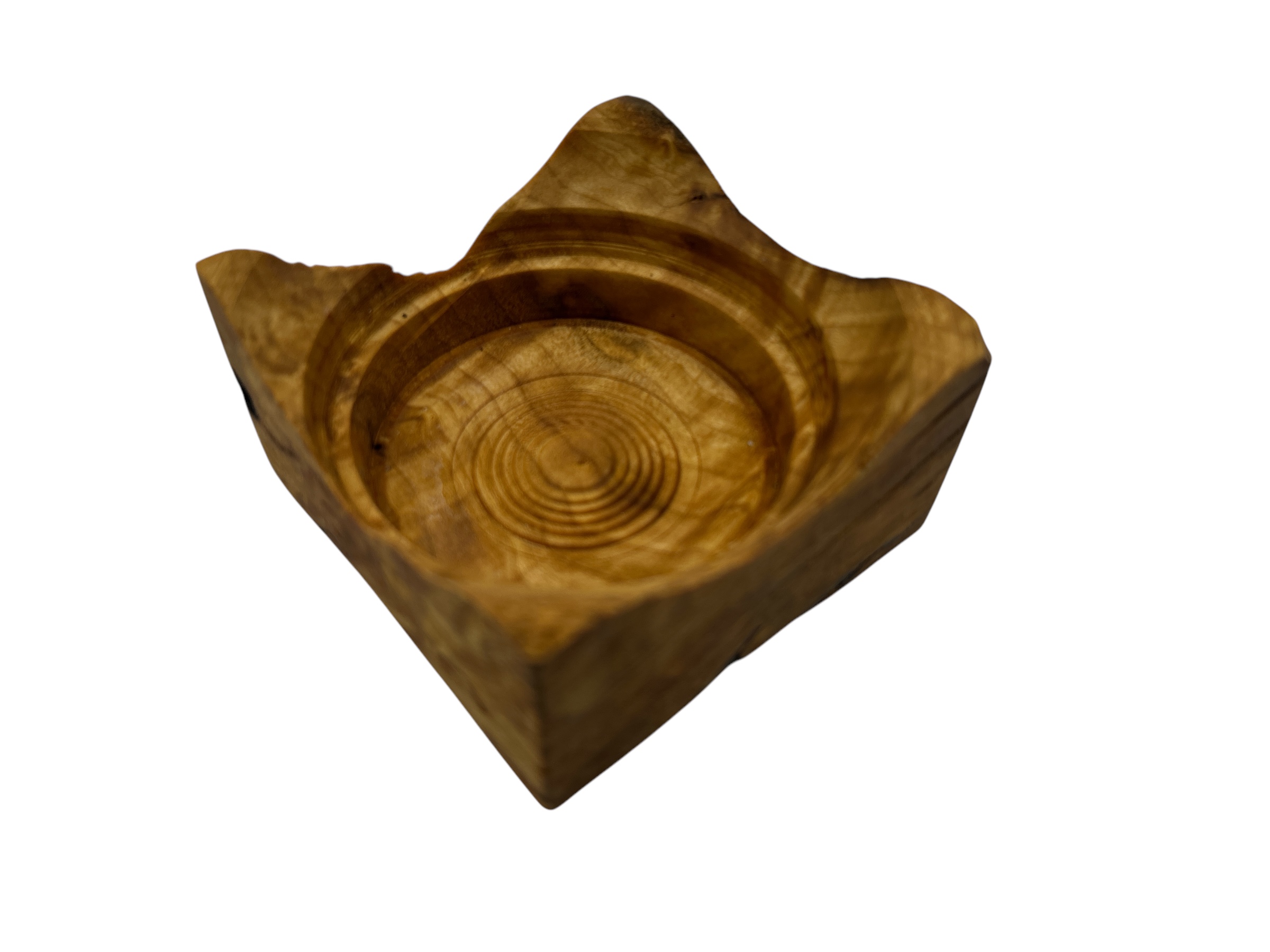 Dieser Kerzenhalter ist aus einem viereckigen Stück Olivenholz bewusst etwas asymmetrisch gedrechselt und bietet Stellfläche für Kerzen mit einem Durchmesser bis zu 7,5 cm.