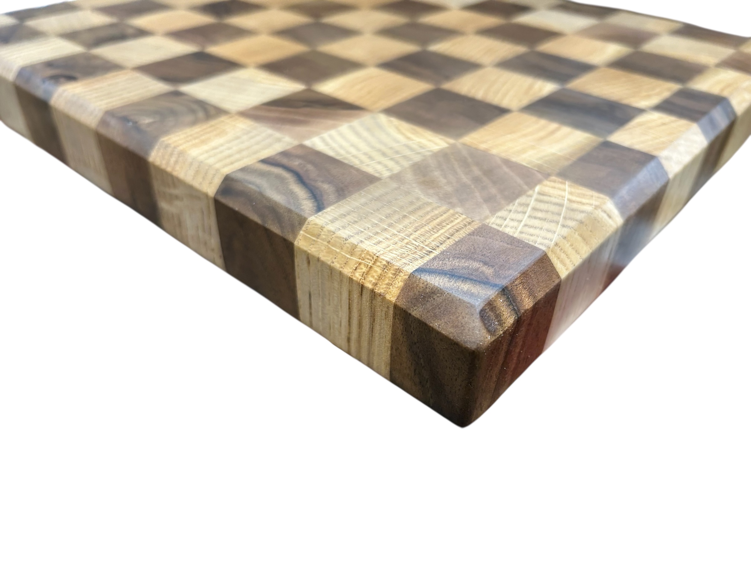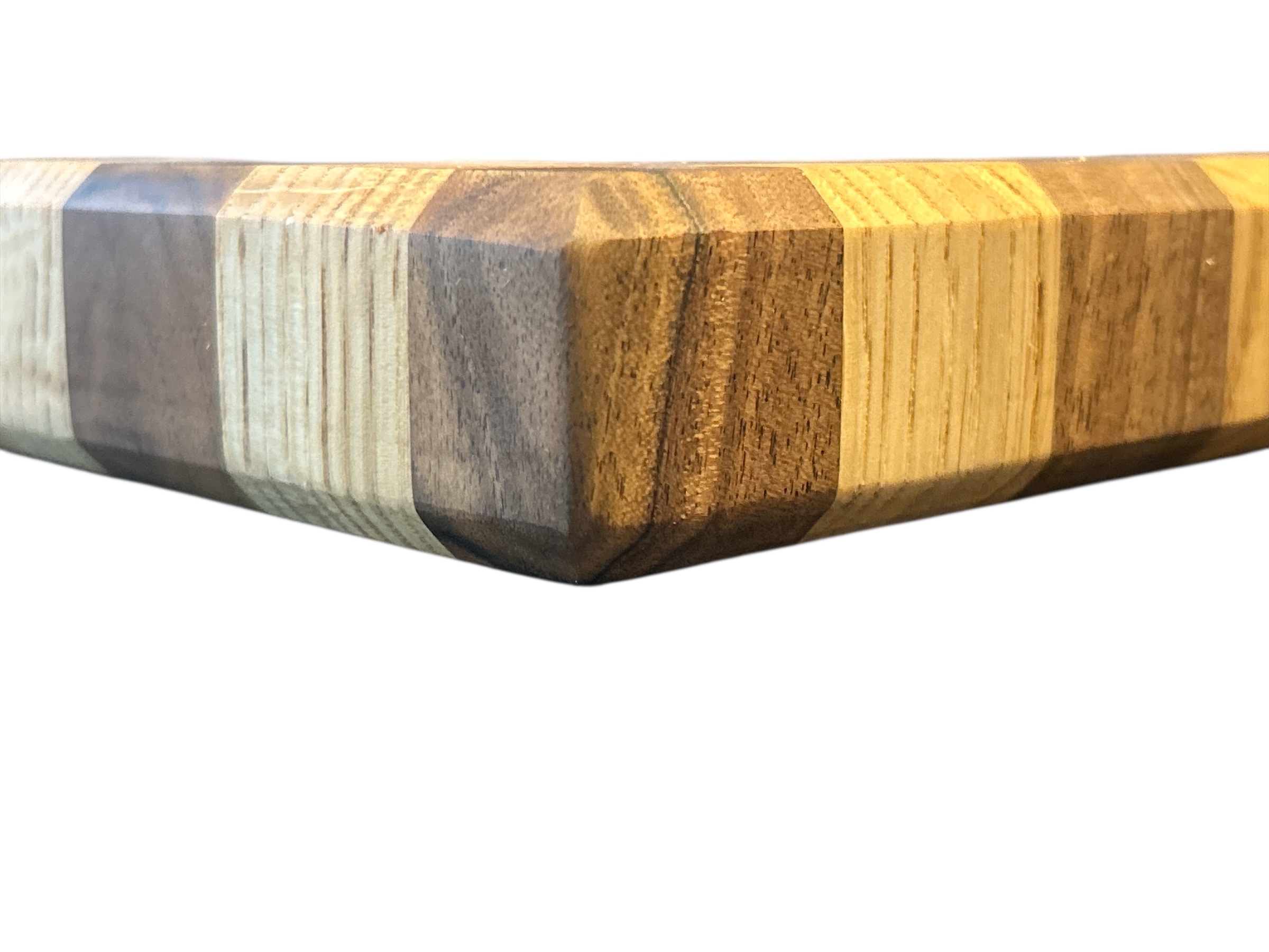Stirnholz-Schneidbrett aus Walnuss und Eiche, die einzelnen Teile des Bretts sind aufwändig miteinander verleimt.