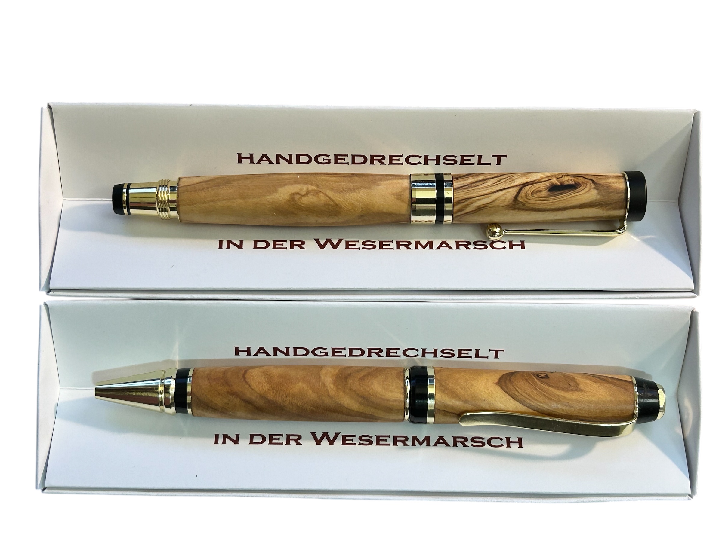Handgedrechselter Dreh-Kugelschreiber und Füllfederhalter mit goldfarbenen Metallteilen.